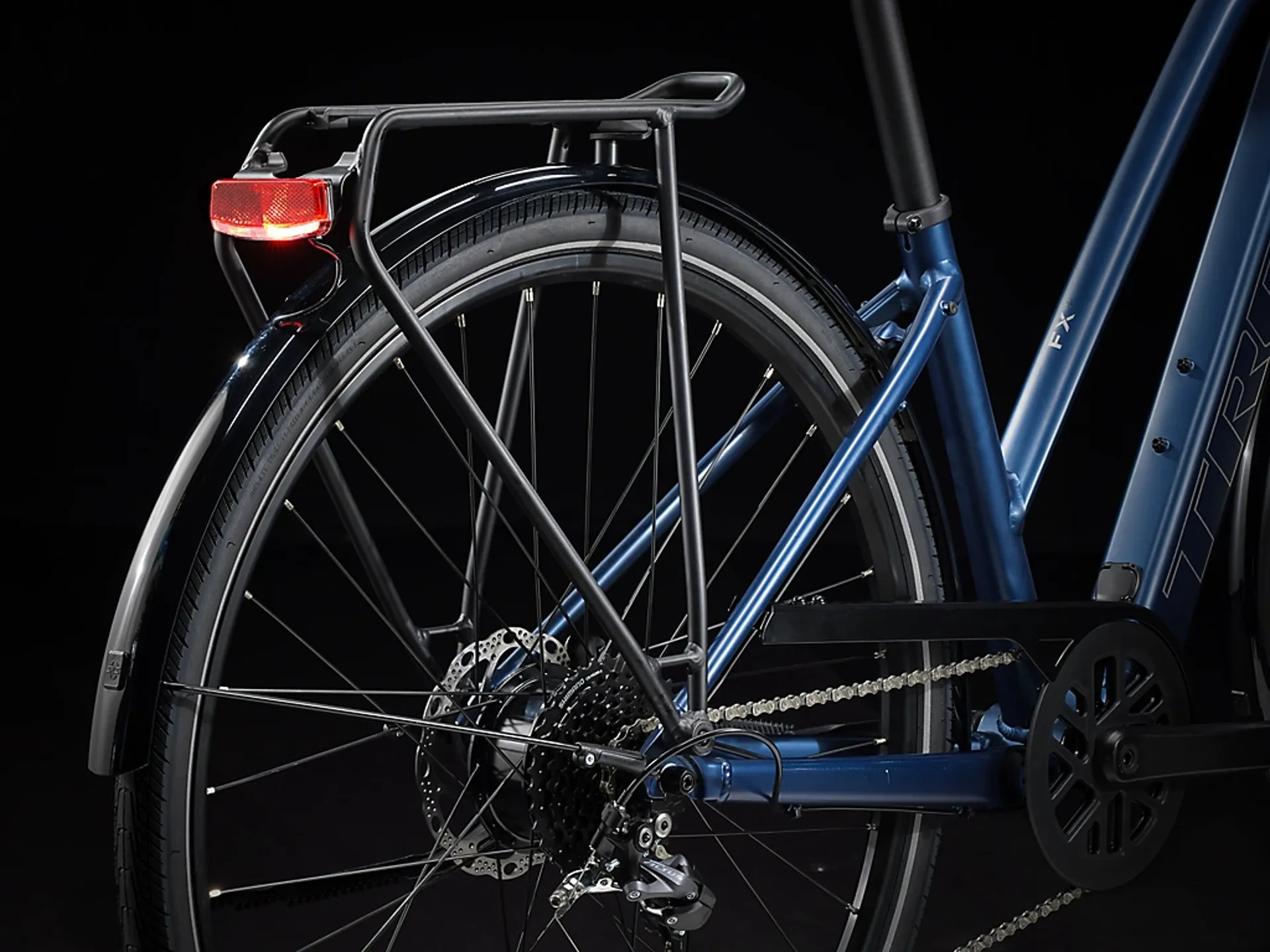 A lightweight aluminium frame with a stagger design that makes it easier to hop on and off, Trek's proprietary pedal-assist system with a hub motor (250 W, 40 Nm) that assists up to 20 mph (25 km/h in Europe) and a 250 Wh battery for a range of up to 56 kilometres per charge. Plus, fast 700c wheels, fast-rolling yet stable 40c tyres with reflective sidewalls, a reliable 9-speed Shimano drivetrain, hydraulic disc brakes, integrated lights powered by the battery, a MIK-compatible rear rack, mudguards and a kickstand.