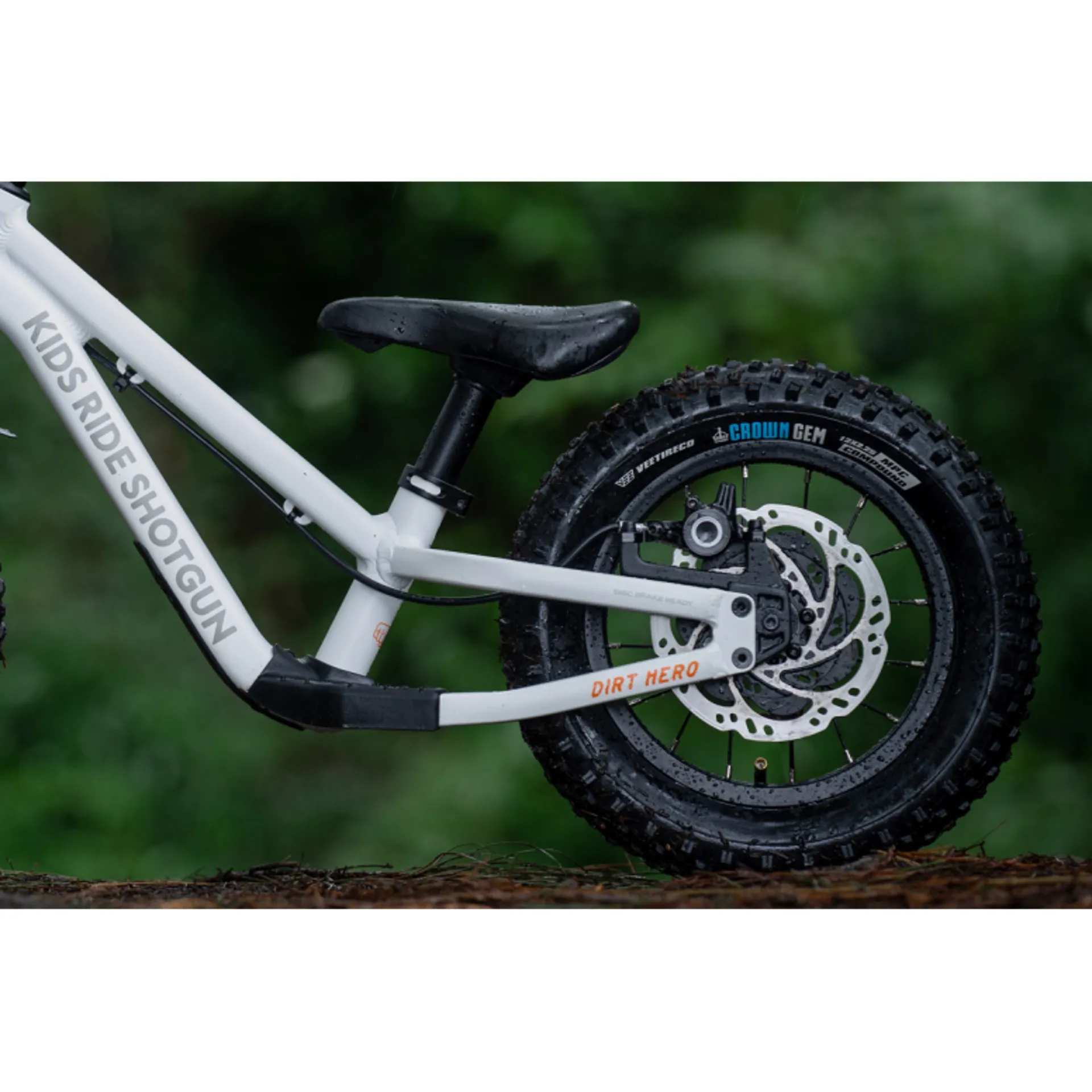 KIDS RIDE SHOTGUN Dirt Hero balance bike is designed specifically for MTB kids who want to take it to the trails. A stacked feature set including 12 - 14” wheel convertibility, 2.25” Vee Tire Crown Gem off-road tyres, mtb geometry and Magura rear hydraulic disc brake inspires confidence and progression in mini mountain bikers who want to get off the driveway and onto the dirt. Each bike comes with 3 Shred Til Bed MTB top tube skins, for your little one to make the bike their own.