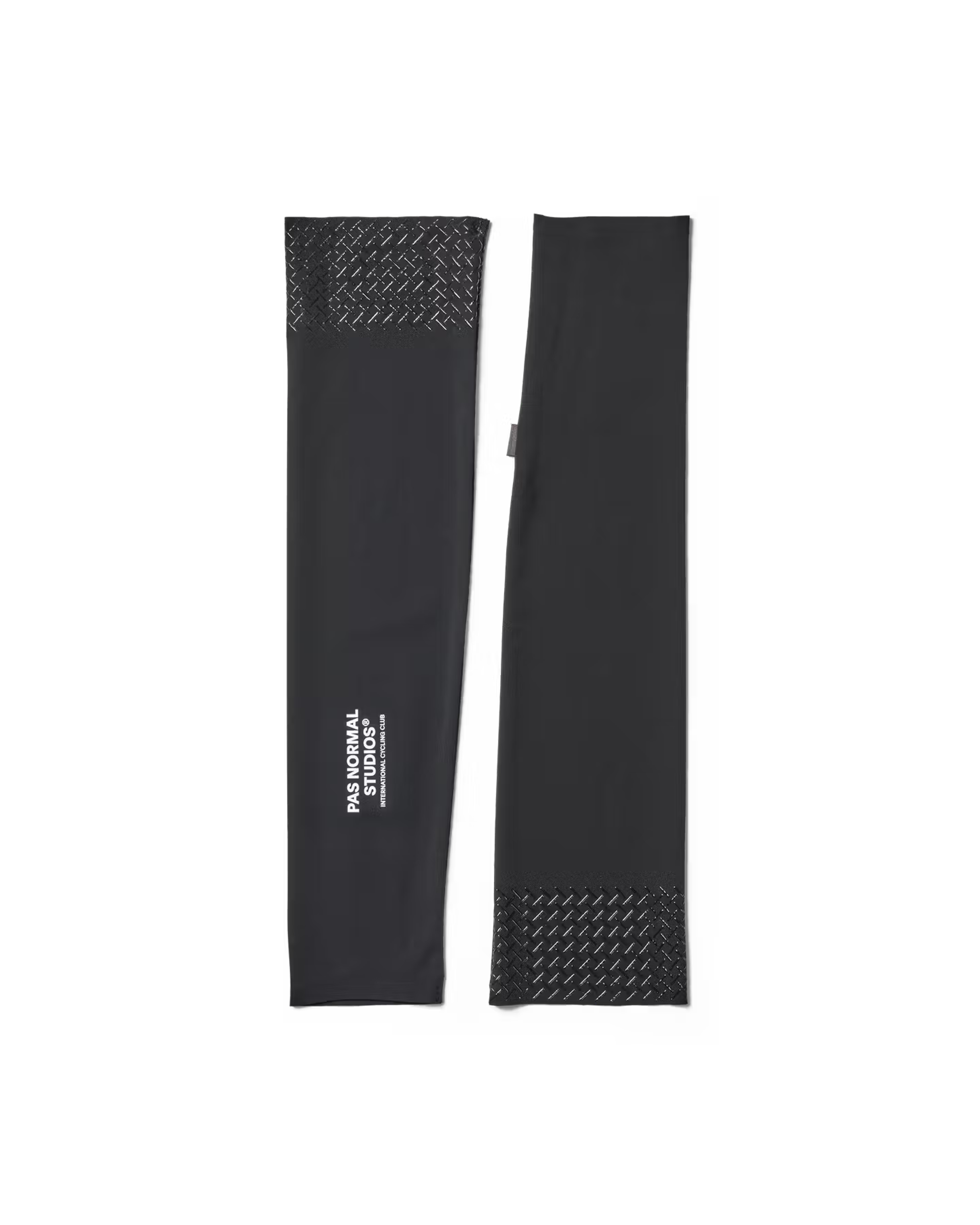 Pas Normal Studios Logo Arm UV Protectors – lightweight SPF 50+ sun protection sleeves with silicone grippers and reflective logo. Breathable, secure fit for warm weather cycling.