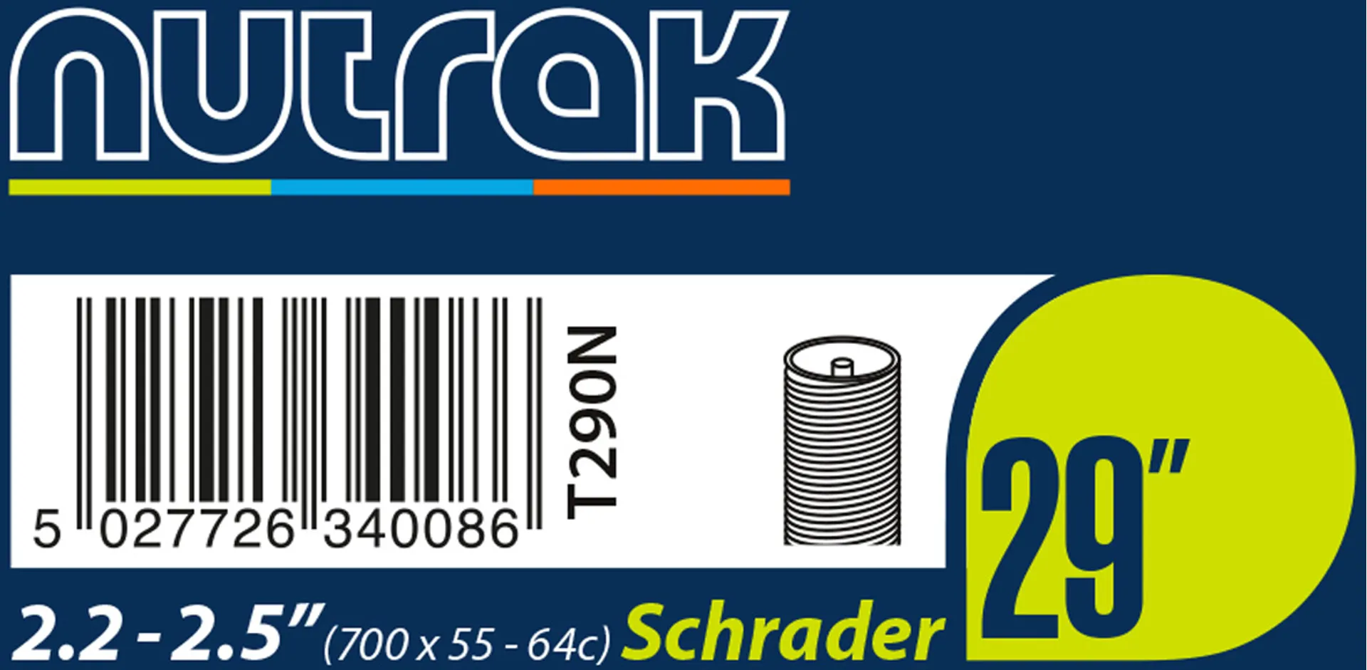 Nutrak Schrader Inner Tube 29 x 2.2–2.5. Durable welded butyl rubber inner tube with Schrader car-type valve. Great-value replacement tube for everyday riding.
